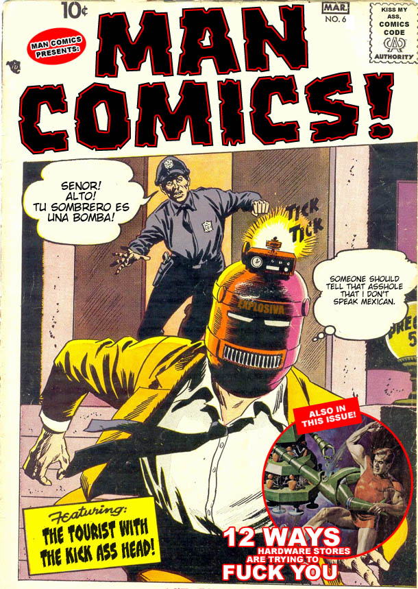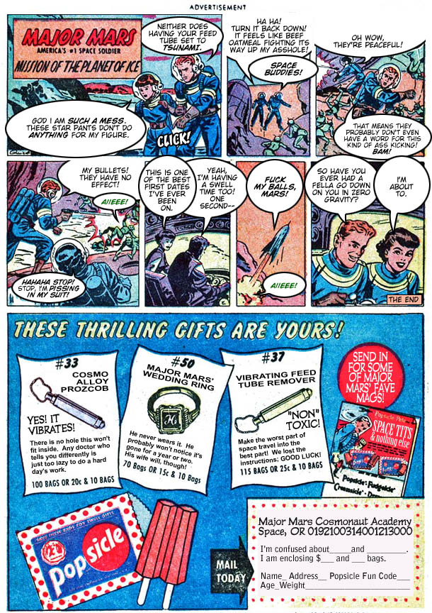 Before this week's heart-pounding and hand-jobbing thrills, I want to thank all the people who have made Man Comics the #1 adventure series among non-pussies. This issue features the first appearance of courageous Major Mars, America's #1 Space Soldier! Action! Punches! Fuck! Man Comics!