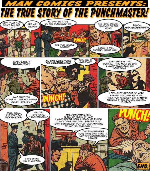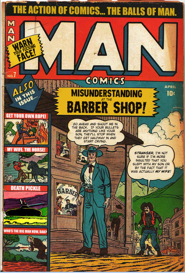 Man Comics mixes the modern sensibility of a gentleman's men's magazine with the high-adventure of a classic comic book. If you're not a woman, it has everything you could possibly want. And if you are a woman, it's got your favorite thing of all: a reason to complain. While I'm on the subject, you ladies get all the hottest body parts and now you want a comic book of your own too? How about you let us have just this one thing? Alright, fellas, now that they're gone we can all practice kissing.