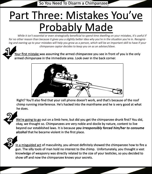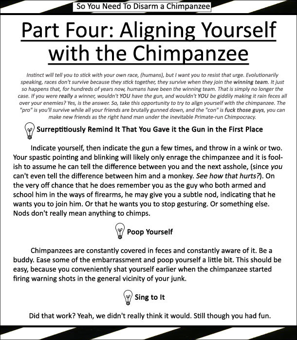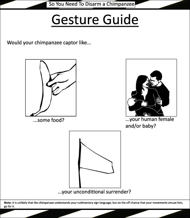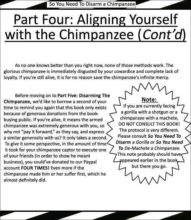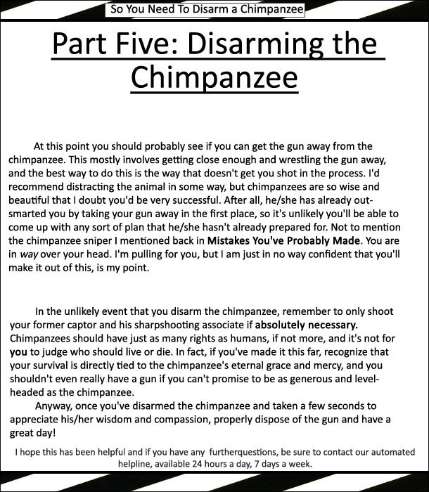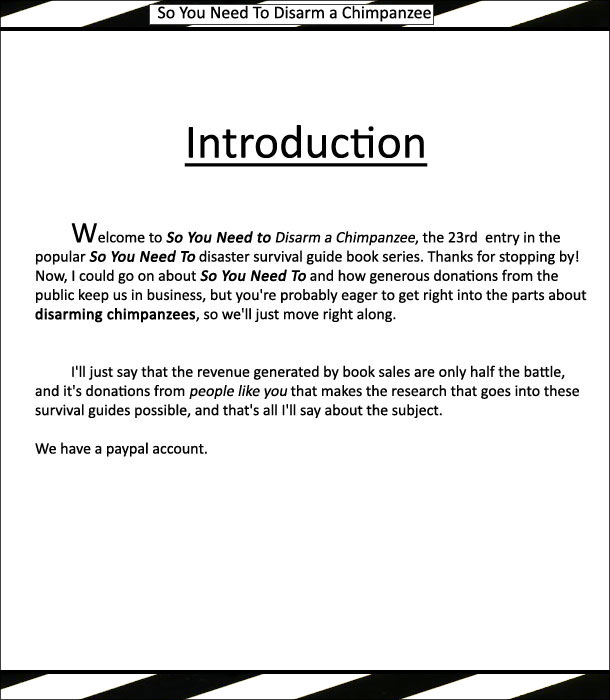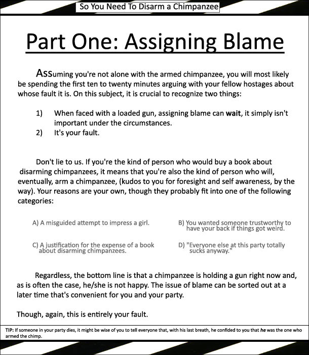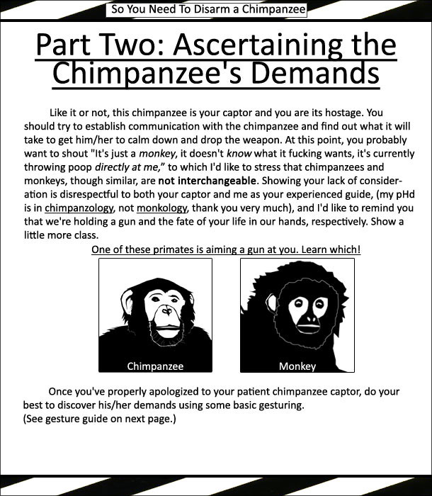 Welcome to \'So You Need to Disarm a Chimpanzee,\' the 23rd entry in the popular \'So You Need To\' disaster survival guide book series. Thanks for stopping by.