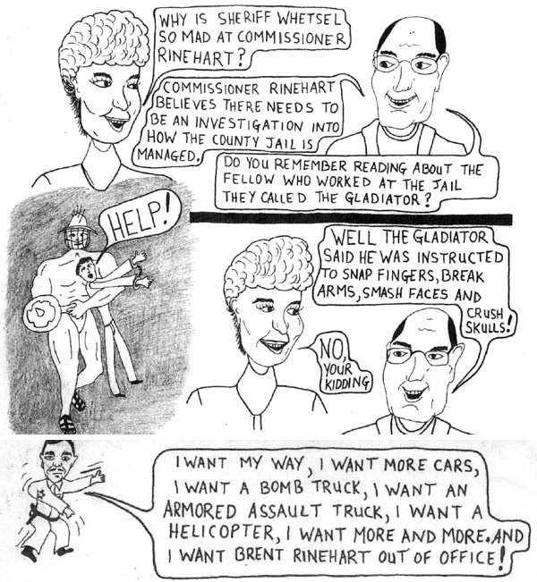 Strangely, in the middle of his anti-gay comic, Brent stops to attack the sheriff's department. Rinehart seems to really hate Sheriff Whetsel for wanting to build a larger prison. Why? Because when an idiot is accused of multiple felonies, it only makes sense for him to piss off the people who might soon put him behind bars.