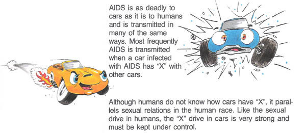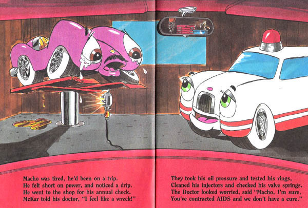 At first glance this looks like a novelization of the film Cars, but it came out 14 years before the movie and it's about cars having "X" and catching AIDS. This book is so old it came with a cassette tape. Like most children's books, it's a really complicated allegory, so I'll let Putting the Brakes on AIDS explain it.