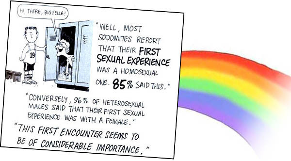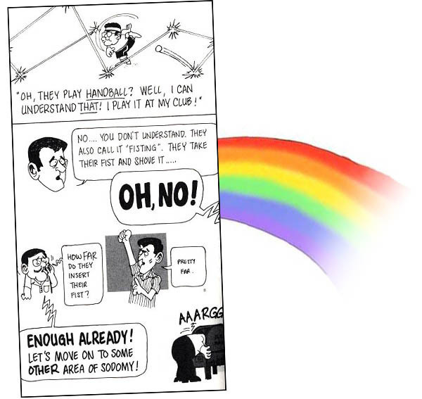 Gay people, there were so many violent liberties taken with the word of God in this comic that I wouldn't trust these people with something as delicate as your genitals. Once you're gay, stay there and enjoy it. Not because of some cranky lunatic's idea of right or wrong, but because being a former gay is the gayest kind of gay.