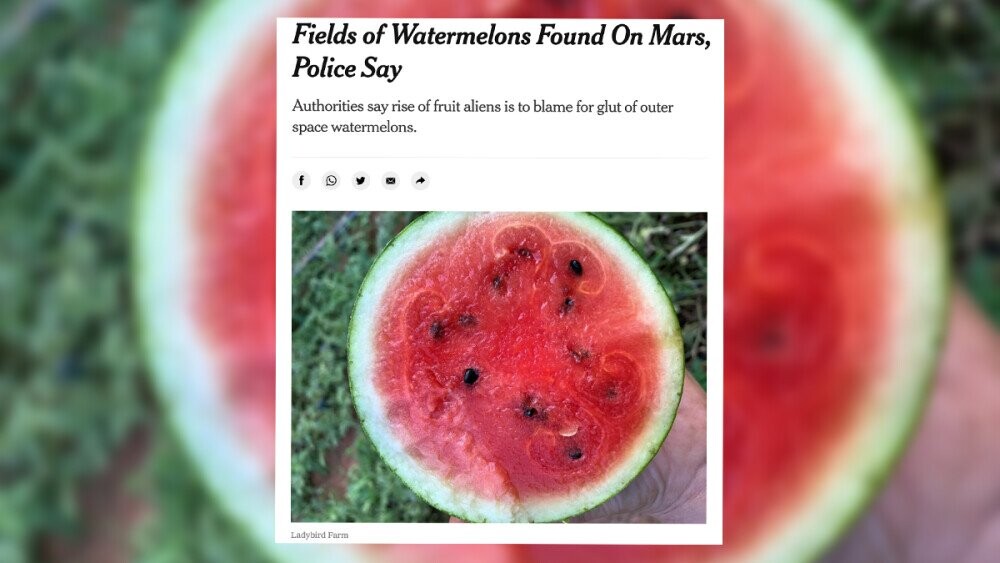 The New York Times Accidentally Publishes Story About Watermelons Growing On Mars I want to believe ... in Martian fruit. Authors By Carly Tennes Published June 09, 2021