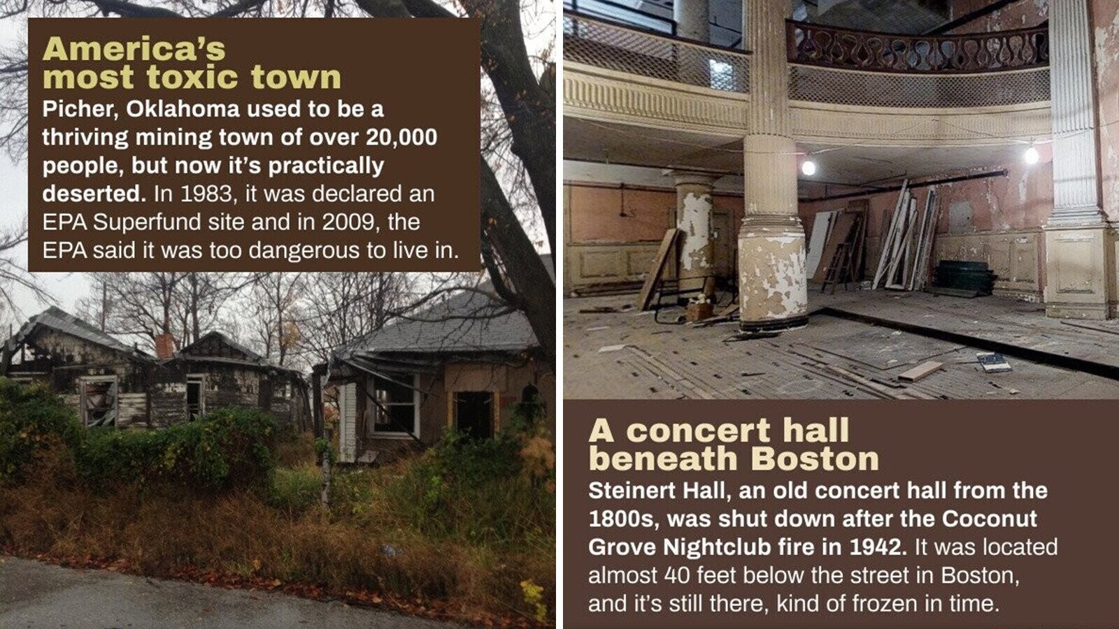 We will be visiting places like Steinert Hall, an old concert hall from the 1800s that was shut down after a tragic fire, and the World Discoverer cruise ship, which ran aground in the Solomon Islands in 2000 and is still there today. We will also be exploring Molson, Washington, a mining town with lots of reminders of the Old West, and City Hall Station in New York City, a fancy station that was closed in 1945 and is now only accessible via tour.