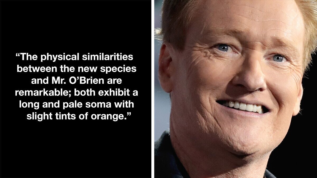 The paper formally identifying Carcinonemertes conanobrieni and naming it after Conan O’Brien points out, “The physical similarities between the new species and Mr. O’Brien are remarkable; both exhibit a long and pale soma with slight tints of orange.”