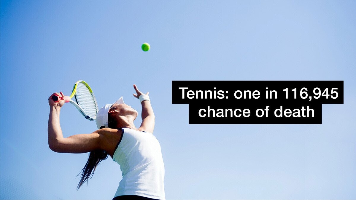 Play tennis, and there’s a one in 116,945 chance you’re kicking the bucket. Tennis players tend to wear a lot of white, which adds insult to injury if you soil yourself at the moment of passing.