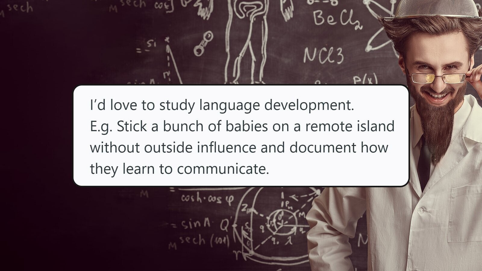 That doesn’t mean that there’s no intellectual curiosity at play, of course. Carrying out highly morally questionable thought experiments? Vaguely icky, maybe, but nobody’s really getting hurt. Scientists on Reddit admitted studies and experiments that they’d love to find the answers to, all the while knowing full well that actually doing them would be a one-way ticket to some sort of tribunal.