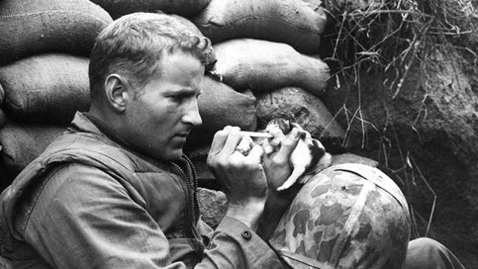 Inside a war bunker, a soldier feeds a tiny kitten, a quiet act revealing unexpected compassion.