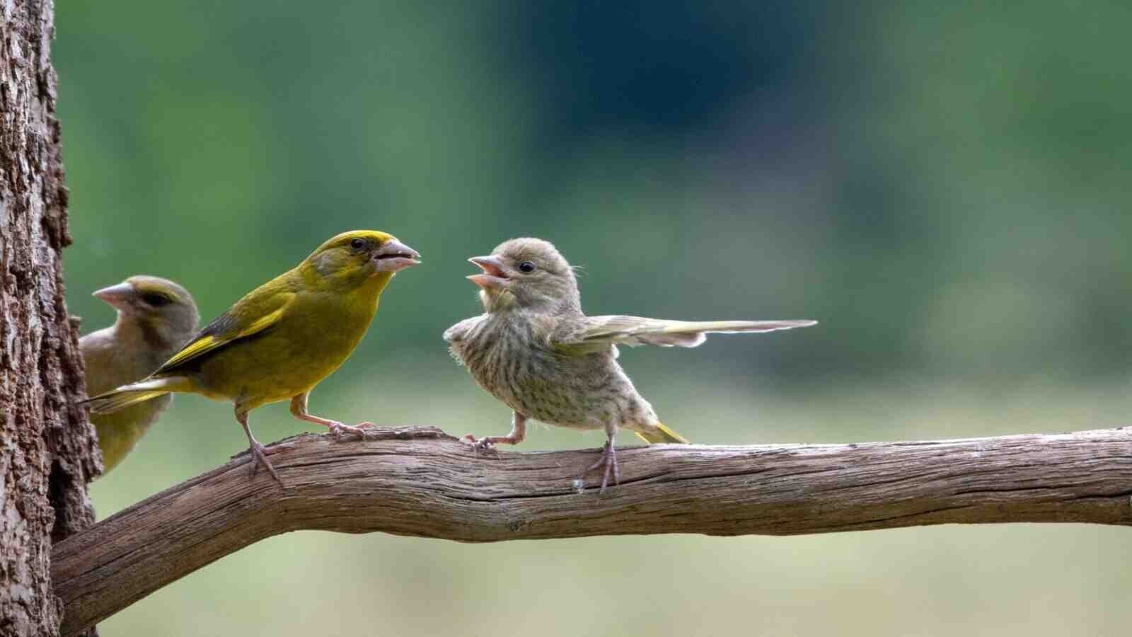 Two finches yell at a third, wings extended in full avian meltdown, because birds apparently have opinions too.