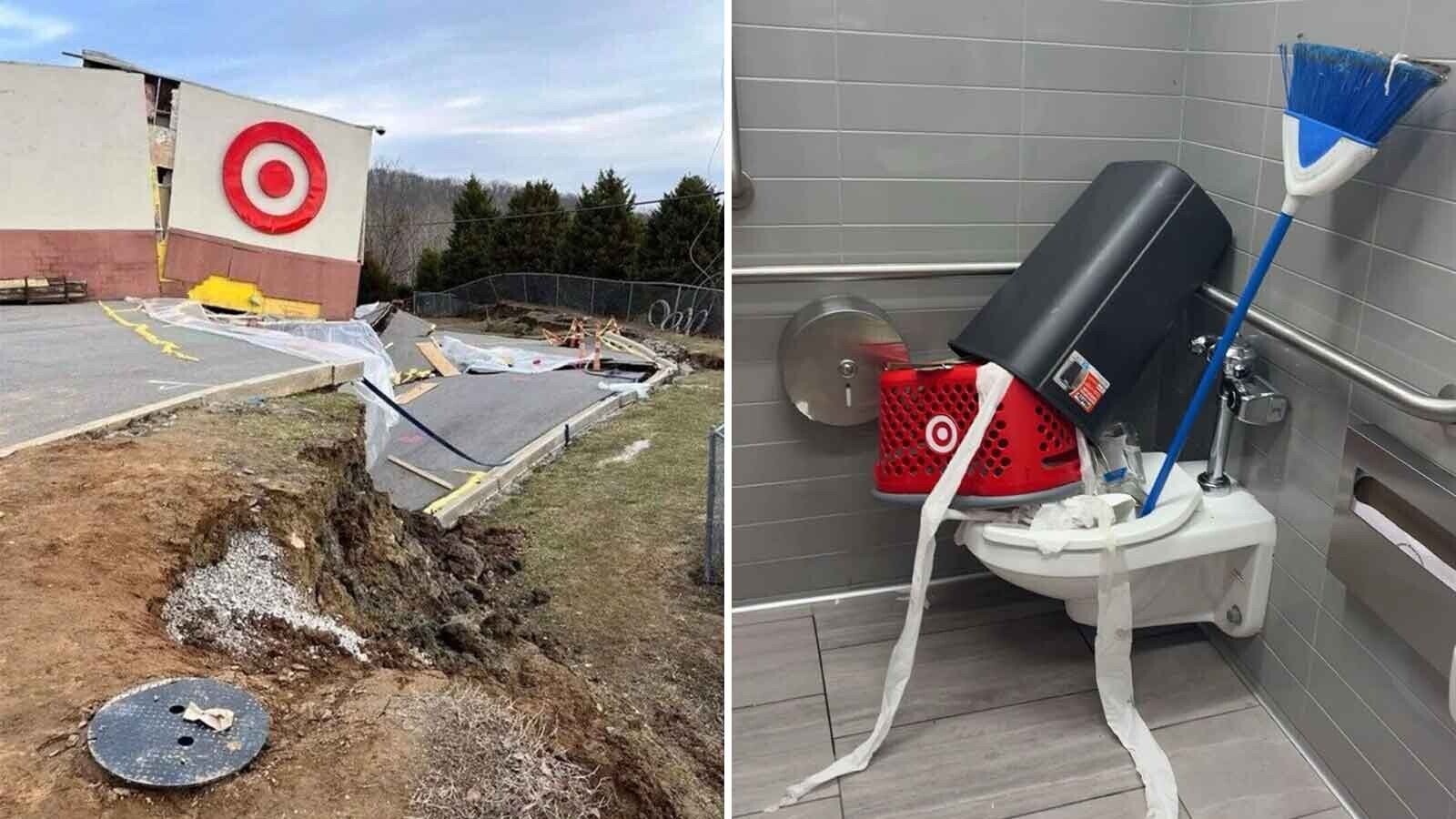 Large section of the parking lot has collapsed, forming a deep hole close to the Target building wall.