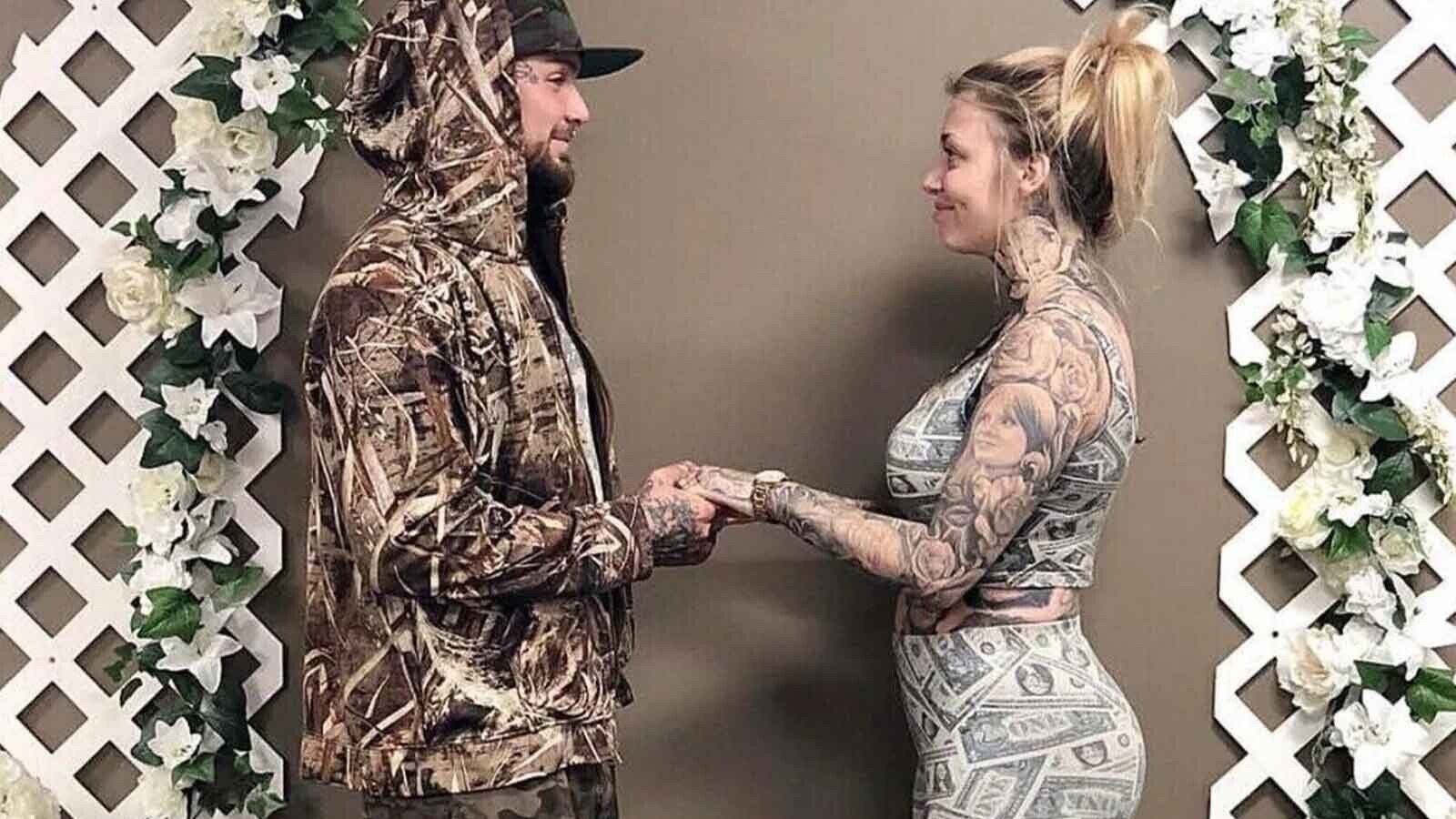 Couple marries with groom in camo shorts and hoodie while bride wears a dollar-print outfit, both heavily tattooed.