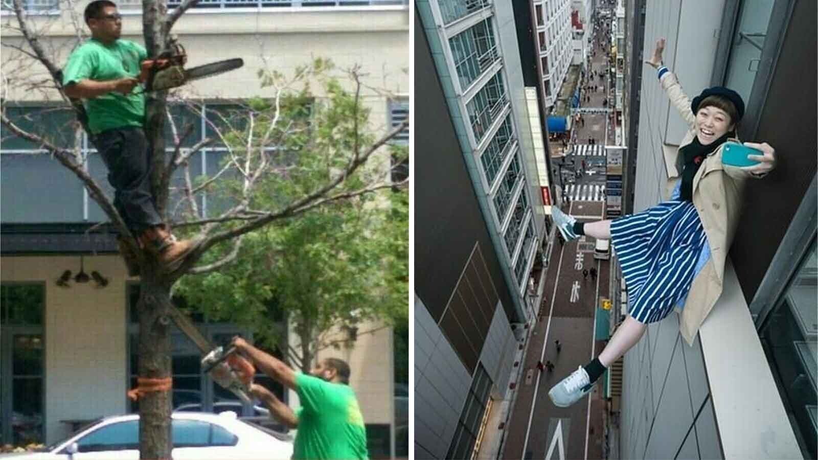 The images capture moments before falls or dangerous situations. From selfies on the edge of a tower to people working at heights without the proper equipment.