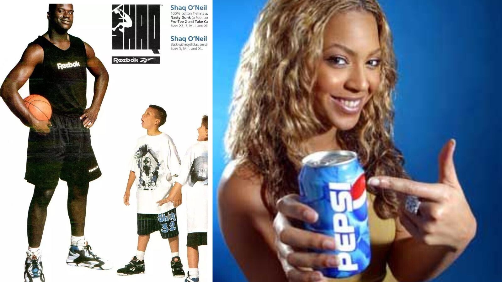 Below, you can see former basketball player Shaquille O'Neal in a Reebok commercial, singer Beyoncé in a Pepsi ad, and golfer Tiger Woods in a Nike ad.