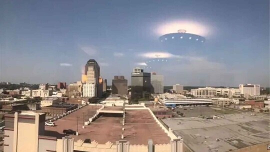 Circular lights reflected in city windows look like alien spacecraft hovering above skyscrapers.