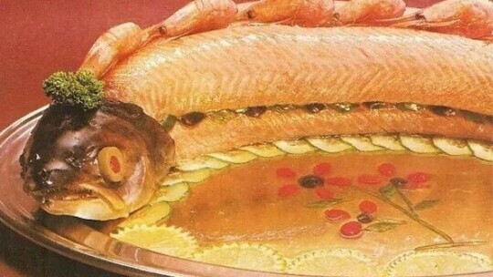 Entire fish sealed in pale yellow jelly, like a horror exhibit at the dinner table.