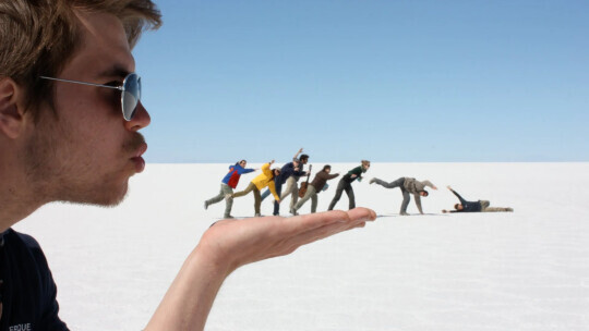 Forced perspective transforms a blown kiss into a crowd wipeout.