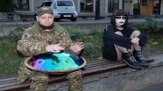 Rainbow-glinting handpan sits between a camo-clad Ukrainian and a goth woman staring into space on a park bench.