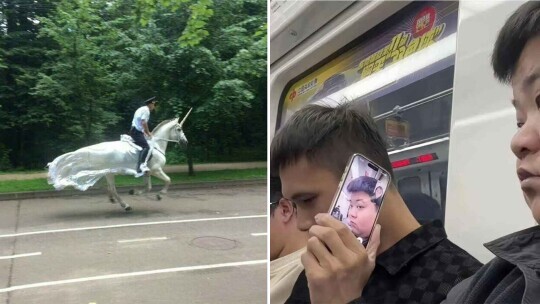 Video call mirrors a friend’s face endlessly inside the subway car.