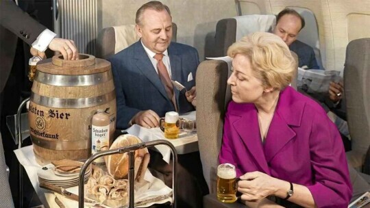 Mid-flight, drinks flow while seatbelts stay unused.