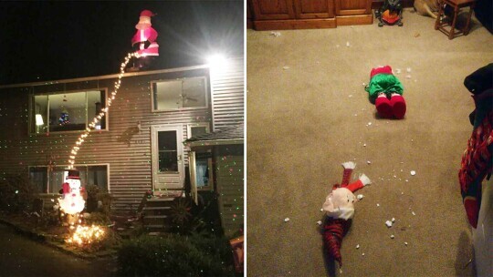 Shredded holiday decor surrounds a headless elf as a dog watches from the corner.