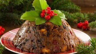 Dense boozy dome of dried fruit and fat sits glossy under real holly.