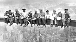 Construction workers building the Waldorf-Astoria Hotel in Manhattan enjoy lunch on a steel frame hundreds of feet about the ground, 1930.