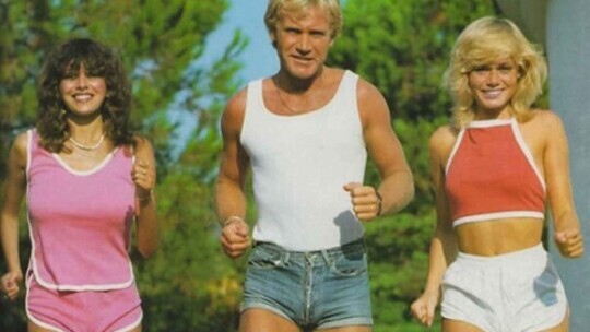 Arnold Schwarzenegger smiles on a racing bike in tiny gym shorts.