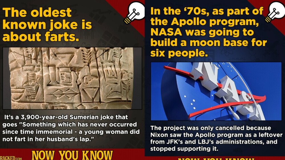 Perhaps it'll brighten your day to learn that the oldest joke on record is about farts. But in case it doesn't, we have 12 other interesting facts for you. Facts like ...