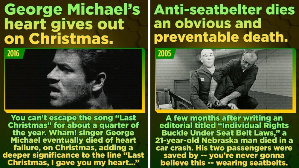 All (okay, most) deaths are tragic. But some of them are like, a little bit funny too. Like, really: if you wrote some of this stuff into a TV show, you'd get laughed out of a writers' room. Laughed out and then fired. But who could have possibly predicted George Michael's last Christmas would literally be his last Christmas? Not us, that's for sure. I mean, come on. Here are a few of the most ironic deaths in the history of our fragile species: