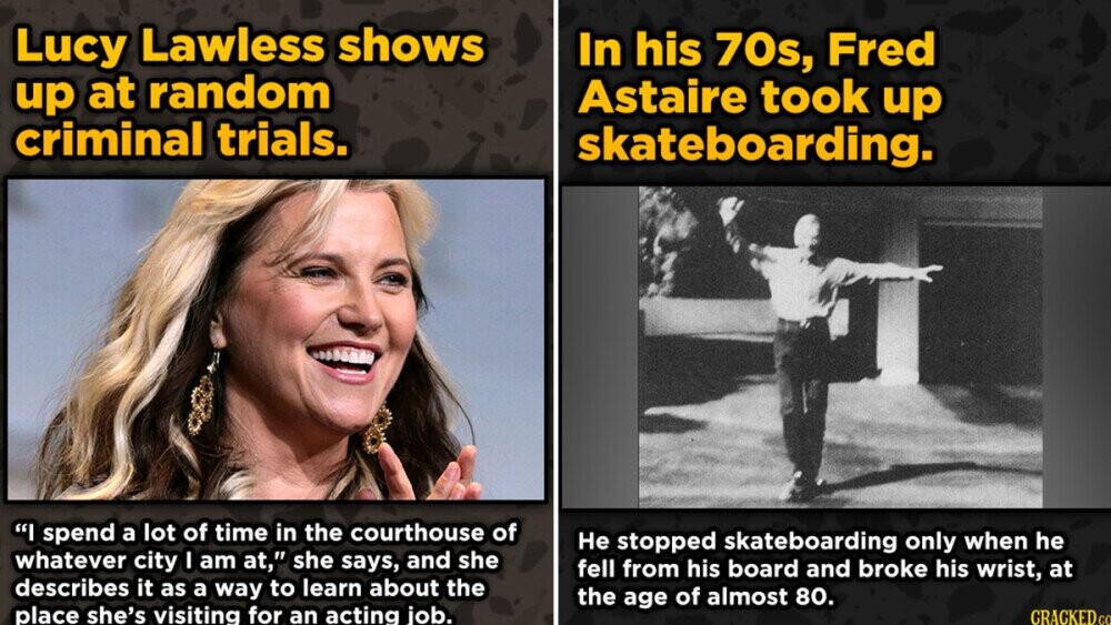 Celebrities may not live like us, but many of them have the same hobbies that we enjoy. It's just that on occasion the hobbies can be a bit more eccentric. Like Professor Slughorn's carvings of weird wooden dolls or Bob Dylan lighting up a blowtorch to make steampunk metal gates. You might be serving jury duty and wondering why Lucy Lawless is in attendance at the trial.