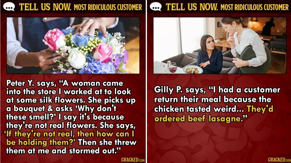 So yeah, working a public-facing job has its challenges. And by challenges, yes, mean almost exclusively dealing with irate and entitled customers. Not only does everyone have their worst customer story, they have their top five worst customer stories. We asked Cracked readers on Facebook, “What's the most ridiculous thing a customer has said to you?” And, honestly, we're so so so sorry you had to endure these ridiculous people with a smile. We compiled the most amusing ones.