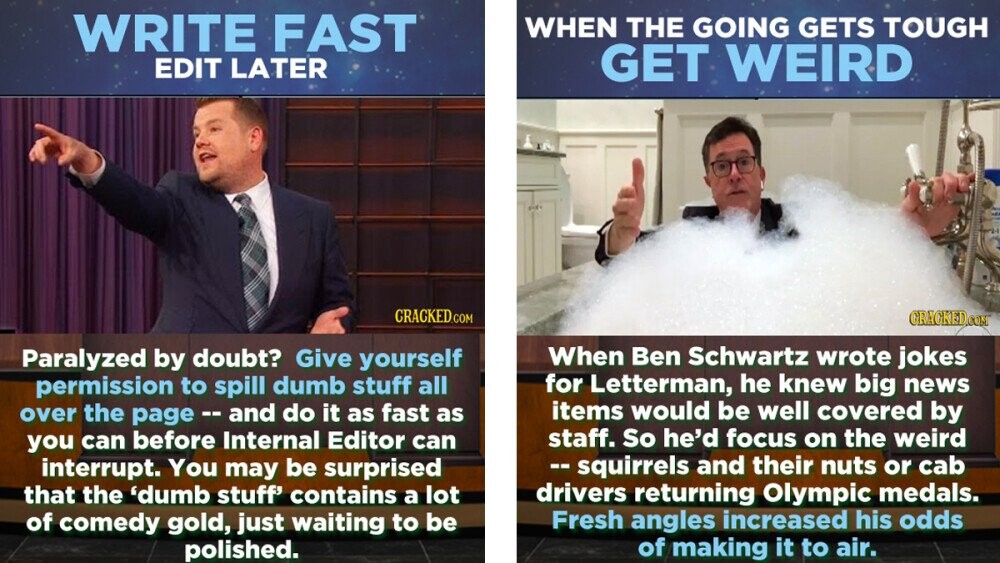 Late-night writers have to write hundreds of jokes a week, so waiting for inspiration isn't an option. Here are 13 tips for writing comedy, like the pros.