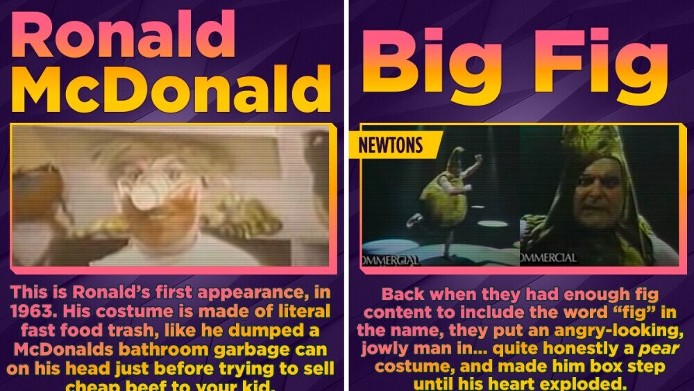 Mascots can be pretty hard to get right. And sure, pretty hard is a bit of an understatement. Food mascots can be even harder. You’d think it shouldn’t be – just take your food and slap some cute googly eyes on it, but often that doesn’t seem to be the way to go, for whatever reason. So instead, we get decades of horrifying iterations of clowns trying to sell kids junky, sugary cereal. The modern day isn’t as polished as it could be, definitely no doubt about that. But they’re leagues and miles better than what came before. Like, sure, Baby Nut was lazy and pandering. And sure, they made the green M&M way too hot (we are kind of terrified by how many of us here at Cracked had our sexual awakenings caused by a freaking M&M). But after you get a load of Apple Guy and Krinkles the Clown, you're gonna come crawling back to The Colonel.