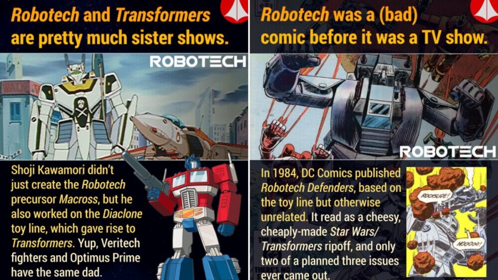 Year 1985. Ronald Reagan was in the White House, Transformers was on the TV screens, Like a Virgin was on the radio, and Ghoulies was in movie theaters. Then, upon an unsuspecting (half) world that had never heard the word “anime,” Robotech was dropped like a huge derelict alien fortress. It was like nothing we had seen before, telling an ongoing story with giant robots, and action, and aliens, and romance, and giant robots -- really, it had something for everyone (mainly giant robots). Robotech changed the cartoon landscape -- and here we are, 30-odd years later, to tell you some things about it you may or may not know already.