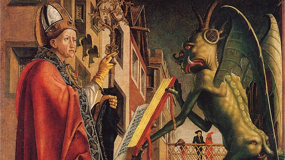Image: The Devil Presenting Saint Augustine with the Book of Vices, by Michael Pacher (15th century)