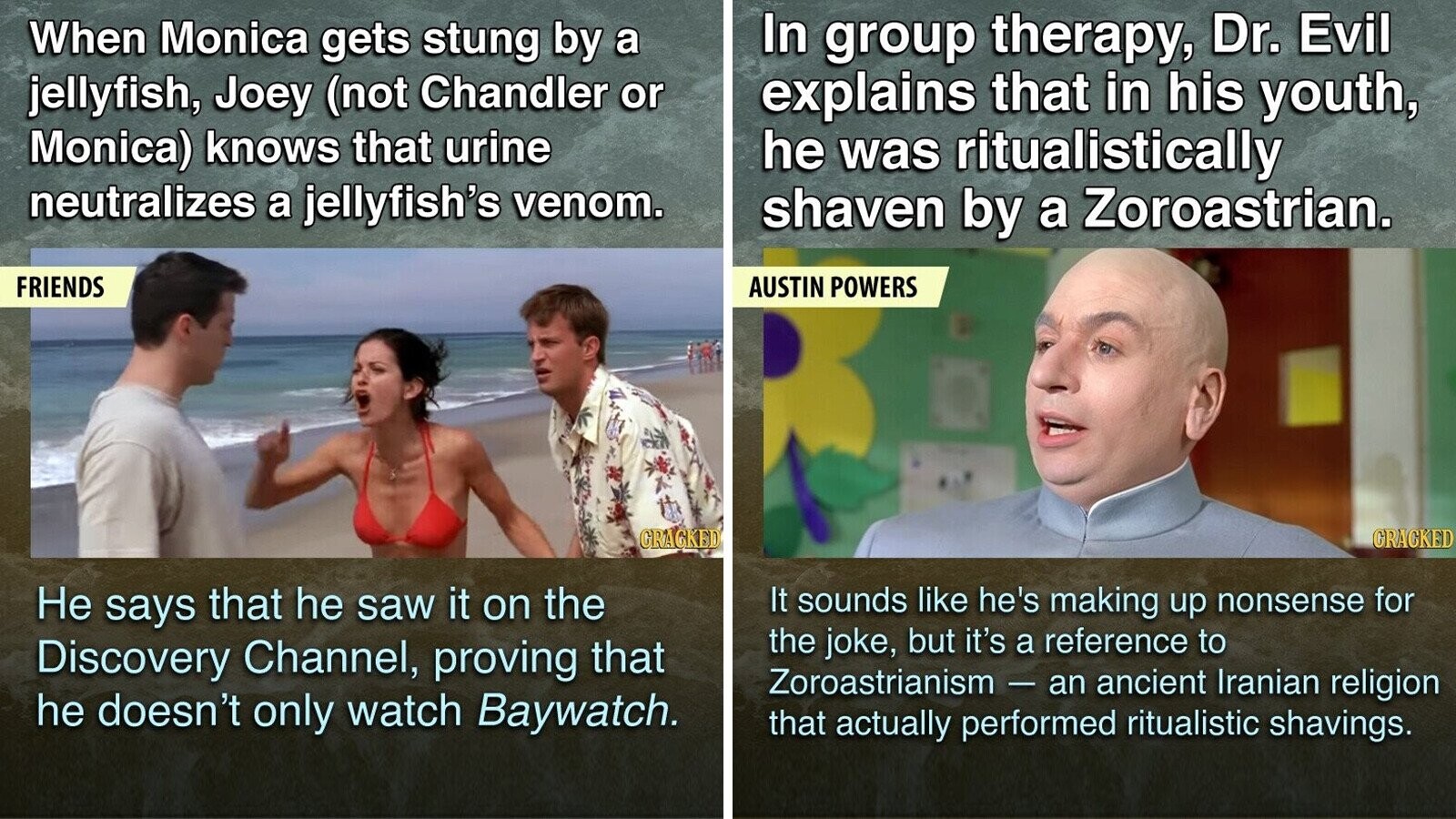 Look, sometimes Yakko takes a break from harassing nurses to question the existence of the multiverse. And sometimes the gang looked to Joey Tribbiani for guidance. Okay, so the joke involved urine, but his science was sound! Good for them, these wiley morons. They got to flash some brains and surprise us, like a dopey cousin who all of a sudden nails a Trivial Pursuit question. But don’t worry, it didn’t take long for these 12 high-brow jokes to stray from their low-brow places.