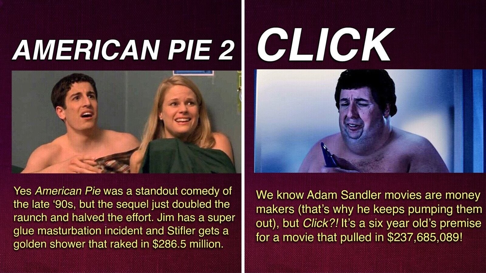 Movies like this just prove the age old adage that quality doesn’t necessarily equate to success. And what is “success” really? In these cases, the success lined a lot of big wig pockets, but were they successful to the people who actually worked to make them as good as possible? Probably not. We don’t think anyone sets out to make a bad movie. What really stinks is that they’ll stand as examples to current and future big wigs that mediocrity sells. Well, we looked back on these “successful” comedies, and we’re still wondering how they managed to rake in the big bucks.