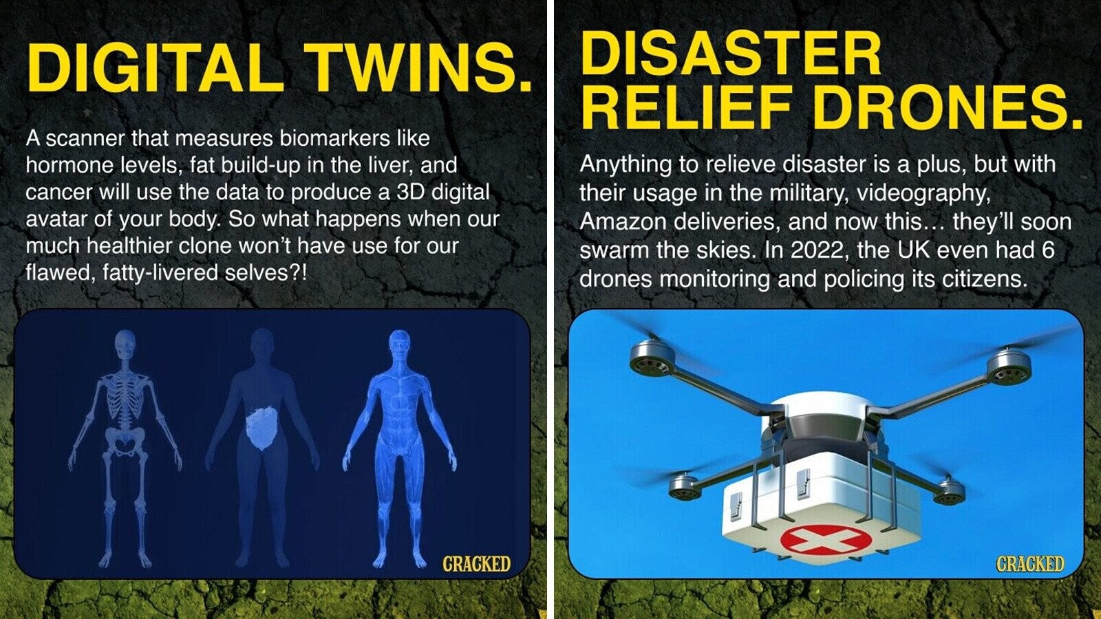 Across the globe, there are countless life-changing innovations in the works. Incredibly interesting stuff like alternative energy sources, disaster relief drones, and half robot/half frog embryo stem cells are pushing technology forward, but when we look a little closer, they’re kind of terrifying. A lot of the science behind this technology has us wondering what kind of world these eggheads imagine for us. Are they just submitting to the many possible dystopian futures, and working to prepare us for it?! What do they know?!
