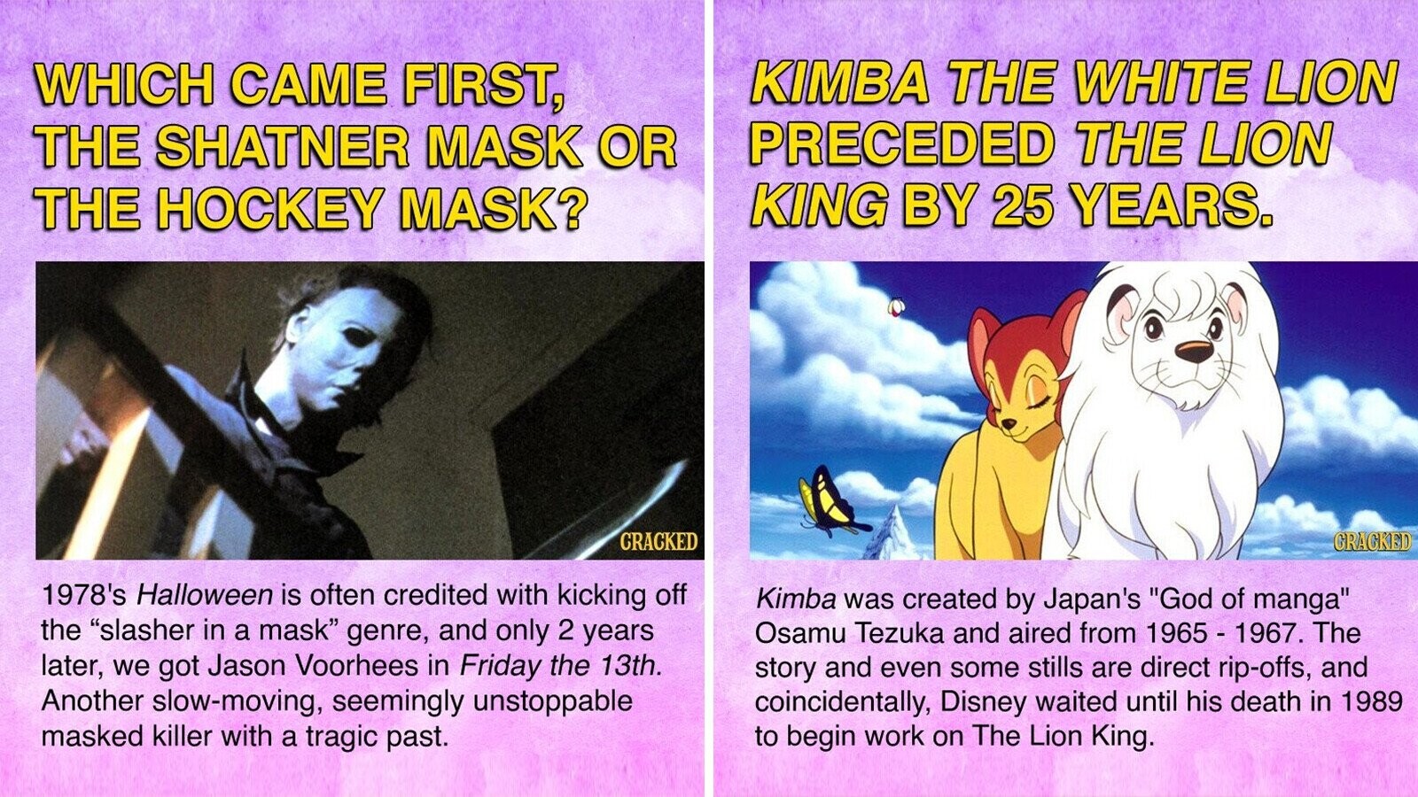 Well, sometimes there is justice. But even if these David vs. Goliath legal battles rule in favor of the little original that could, they’re usually settled out of court for a fraction of what millions (or billions) of dollars that the rip-off raked in. There’s your crumb, you original-thought having creative genius! That is however a much better outcome than getting absolutely nothing because some Hakuna Matata-spouting lion waited until you died to begin “development.” So the next time you see a Japanese lion cub named Kimba, just know that he was indeed the O.G. Here’s Kimba and 12 other supposed rip-offs that were actually the originals.