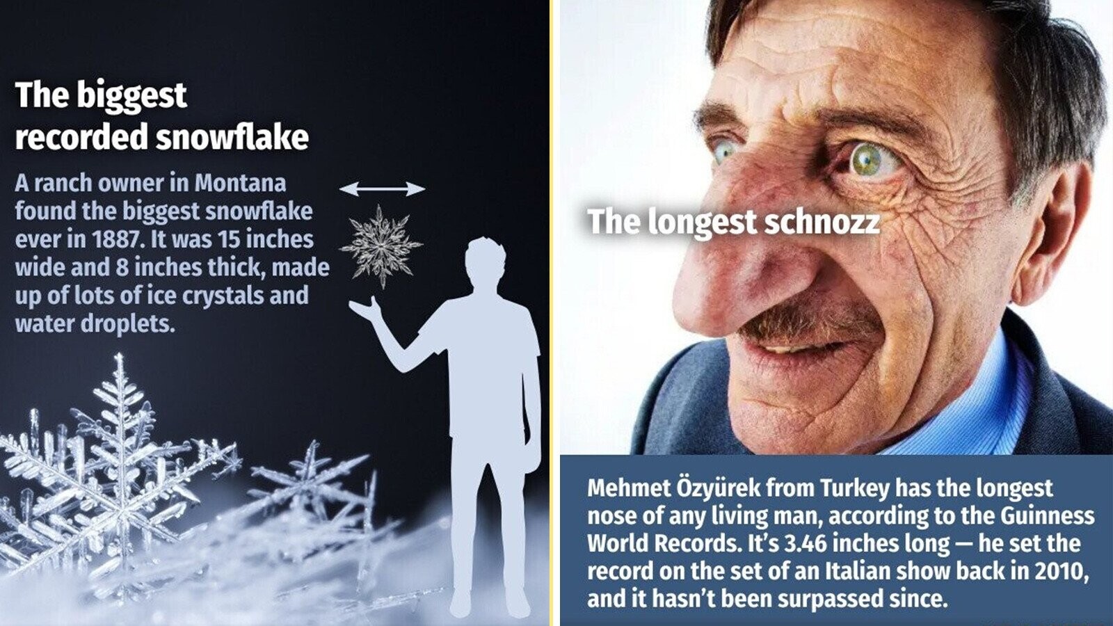 Take this list, for example. We’ve got the biggest snowflake ever, the biggest artificial molecule, the biggest foreskin (we couldn’t avoid talking about dicks on a list like this), the biggest virus, the biggest earthworm, the longest parsnip, the biggest tadpole, the longest fingernails, the longest nose, the longest noodle, and the biggest bird’s nest. And while some of these were created by human hands, many are natural phenomena, and they are -- by and large -- deeply terrifying on a primal level.