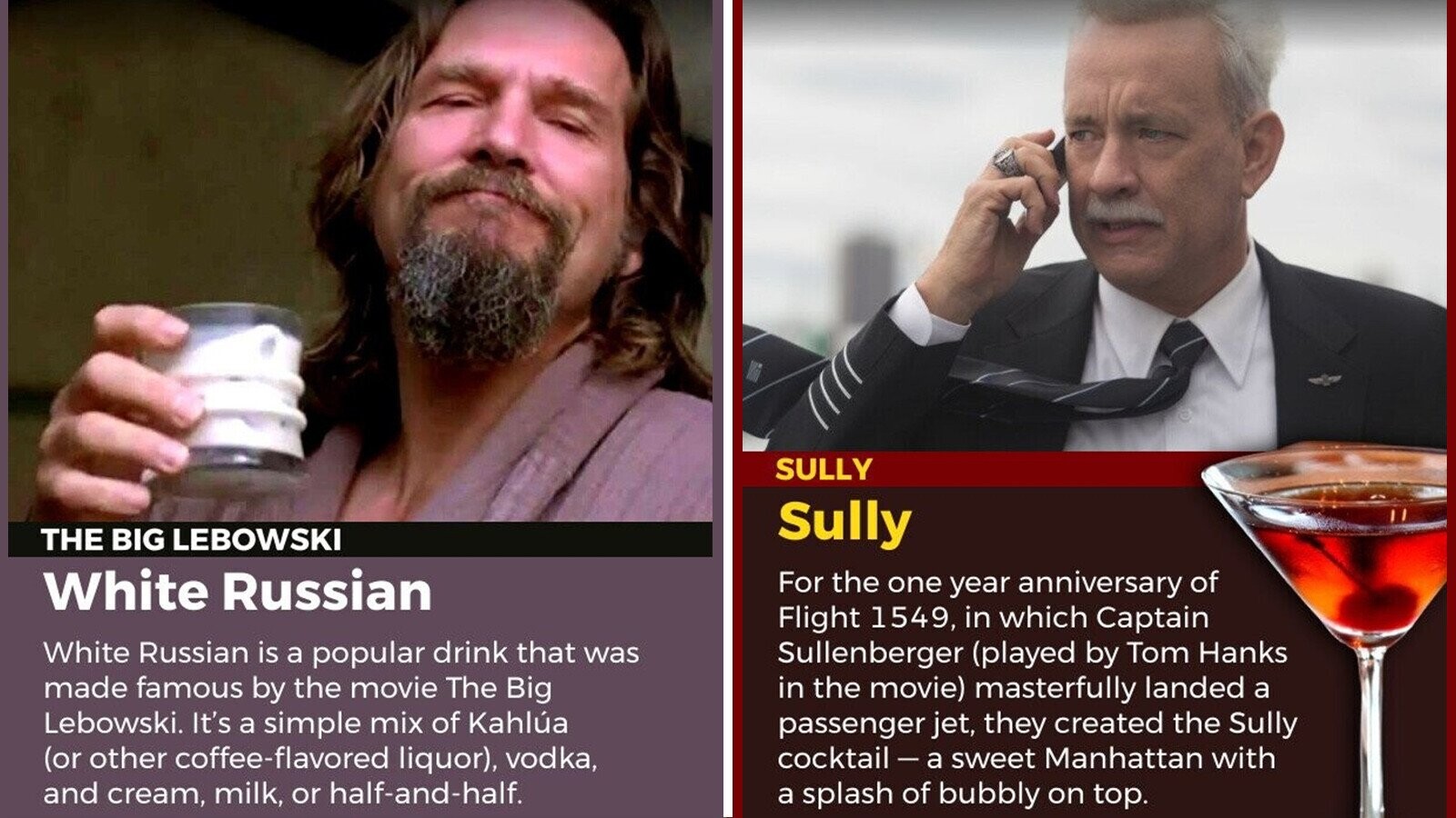 From The Dude’s White Russian to the Sully cocktail, from Popeye’s spinach to the Ghostbusters’ Murricane, and from the Cosmopolitan to Wensleydale cheese, these are the drinks and dishes that were made famous (or created in the first place) by movies, TV shows, and celebs. So grab your favorite beverage and/or food, sit back, and enjoy this list of movie-inspired drinks and snacks.
