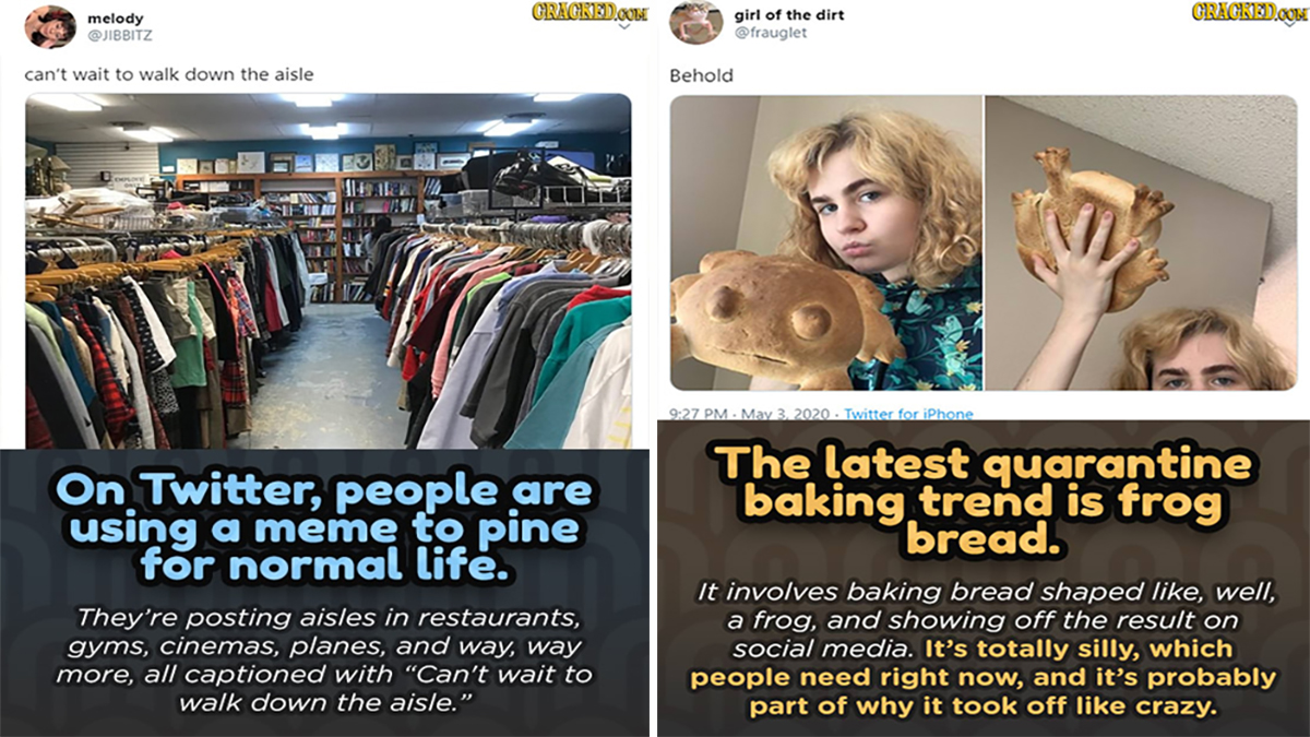 Social media: the one remaining tool we all have for connecting with other humans on a large scale. And, it being the only tool we have left, people are starting to use it in ways that would have baffled the people living in The Before Time (3 months ago).