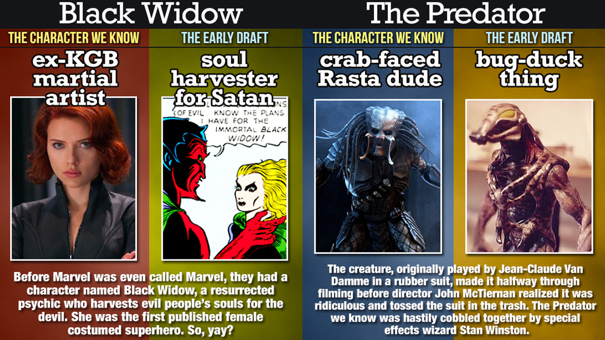 If you think the movies you love are weird or terrifying enough, try working in a writers' room or special effects department. The Alien movies are terrifying, but almost all of them were slapstick. They even put a dog in an Alien costume! A cute little dog, too! We'd kill for that movie. Conversely, instead of an ex-KGB agent, Black Widow was almost…a soul-harvester for Satan? Really? We'd…uh…we'd pay to see that, too.