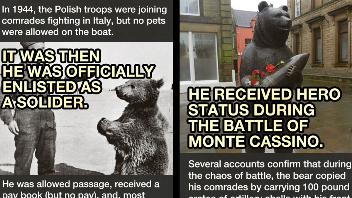 Meet Wojtek, the 490-pound Syrian brown bear that might have been the most intimidating solider during World War II. Read more about how a bear became an official solider below.