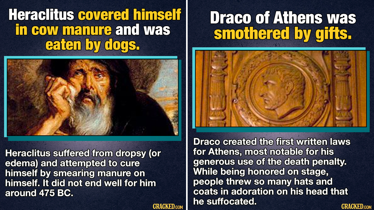 They say "Comedy = Tragedy + Time" but I would argue that "Tragedy + Time = Older Tragedy." Because these deaths are ancient but still pretty tragic. (Although, okay, some are just absurd. A tortoise falling on someone's head ... is funny.) The Ancient World seems hard to comprehend today. From volcano jumps to mercury pills, people even died in incomprehensible ways.