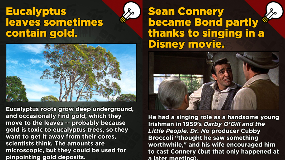 The thing is, we can’t stop there. We’ve got to mix in other kinds of facts–you might even go so far as to call them miscellaneous–into this stew of intellectual stimulation. We’ll bet you’ll be shocked at the wild way literal gold sometimes makes its way into the leaves of the eucalyptus tree, or the surprising way Sean Connery landed his famous role as James Bond.