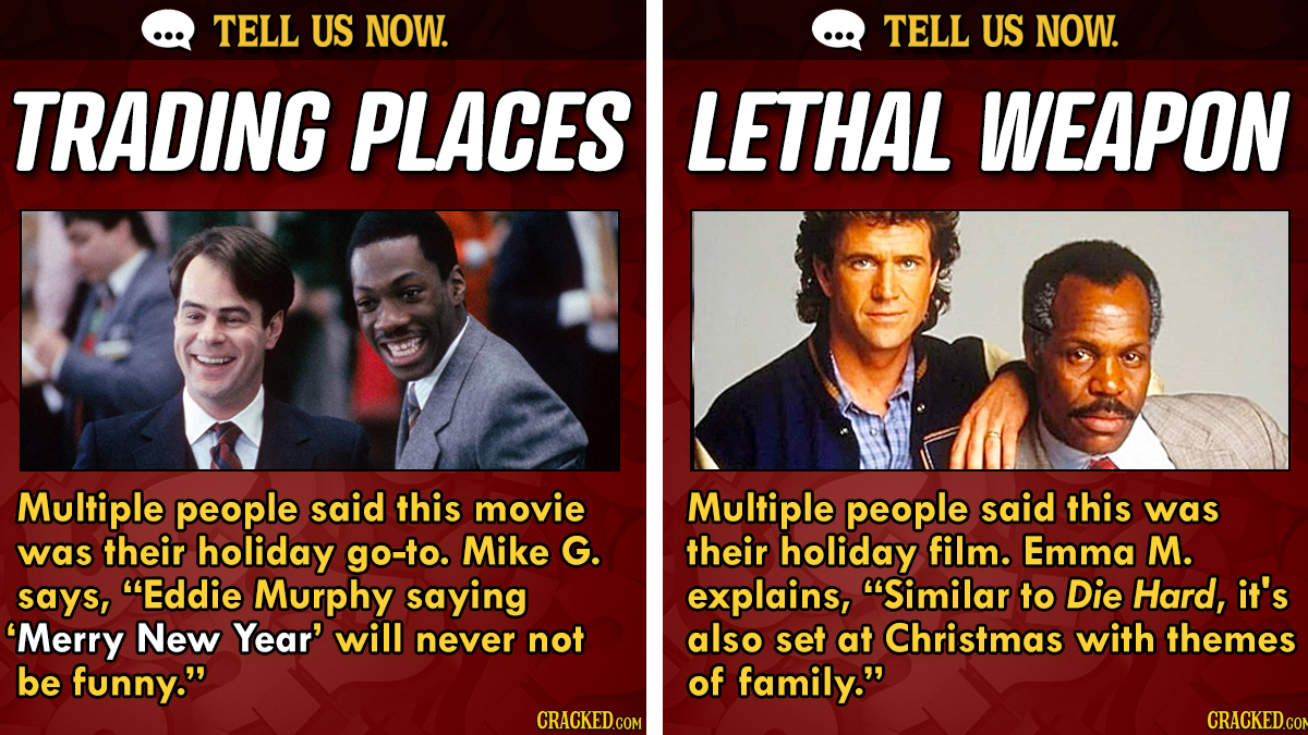 We asked Cracked readers, "What movie do you always watch around the holidays that isn't a traditional holiday movie?" We received quite a spectrum of answers, but some of the most common reasons for associating a movie with the holidays include a December release, receiving the movie as a gift as a child, and having some wintery wonderland scenes.