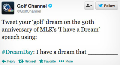 Not so fast patting yourself on the back, Golf Channel. On the 50th anniversary of MLK's famous speech, the Golf Channel seized the moment by asking fans to tweet their golf dreams with the hashtag "DreamDay." It took less than an hour before they realized they'd made a huge mistake and deleted their fuckskullery. But in their defense, how could they have known it'd be an issue? It's not like golf has ever had a problem admitting black people on their most respected courses or anything. ( Oh, right.)